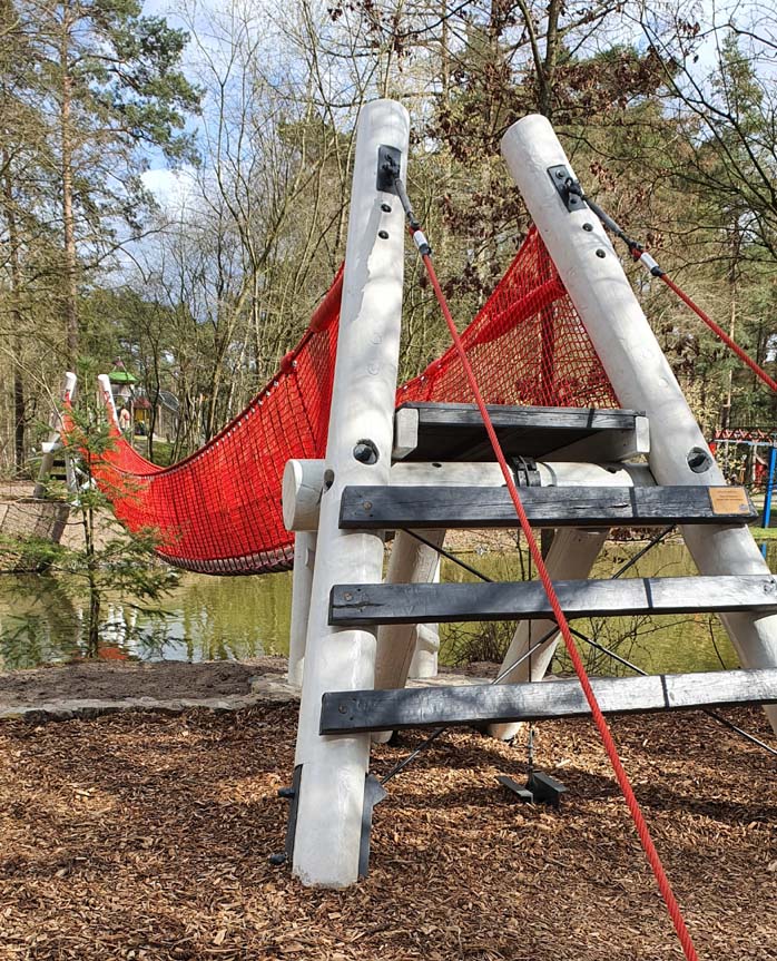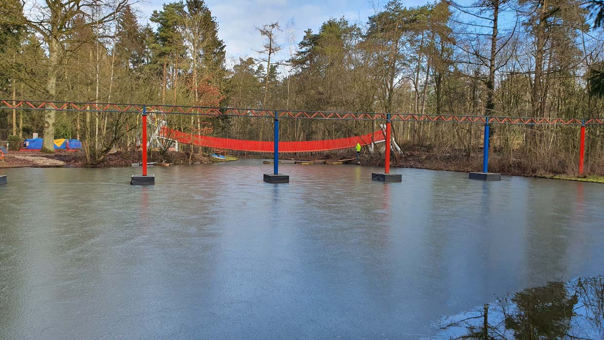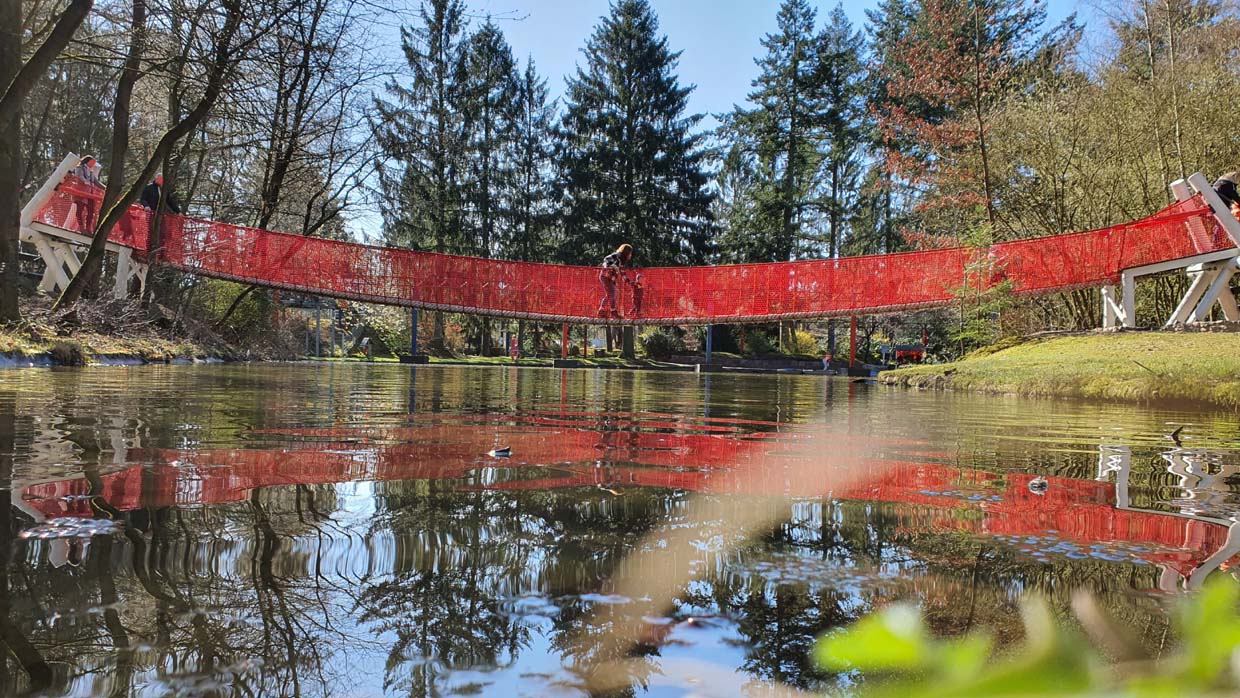 Erlebt einen wackeligen Riesenspaß über unserem See. Die Brücke führt über das Wasser, unten die Ruderboote, oben steht ihr alle zusammen und versucht das Gleichgewicht zu halten. Diese Brücke ist übrigens eine der längsten Ihrer Art in einem deutschen Freizeitpark.