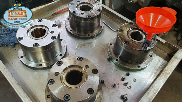 In der Werkstatt werden gerade sogenannte Freiläufe generalüberholt. Das sind Bauteile aus dem Antrieb der Achterbahn. Die Spezialkupplungen sorgen dafür, dass die Antriebsräder in der Strecke der Achterbahn vom Zug ohne Widerstand überholt werden können. Dass heißt wenn der Zug schneller als die Antriebe ist, kann dieser ungehindert durch die Räder fahren, bis der Zug soweit verlangsamt ist und die Antriebe den Zug dann antreiben. Auch beim Verlassen der Reibräder sind die Freiläufe wichtig, damit der Zug diese ungehindert verlassen kann, sobald der Zug den Berg herab fährt und dabei schneller wird. Diese Bauteile sind eine sehr feine Mechanik aus Klemmbacken und Federn, die immer im guten Zustand bei sauberem Öl sein müssen, damit die Antriebe zuverlässig greifen oder durchrutschen, je nach Situation.