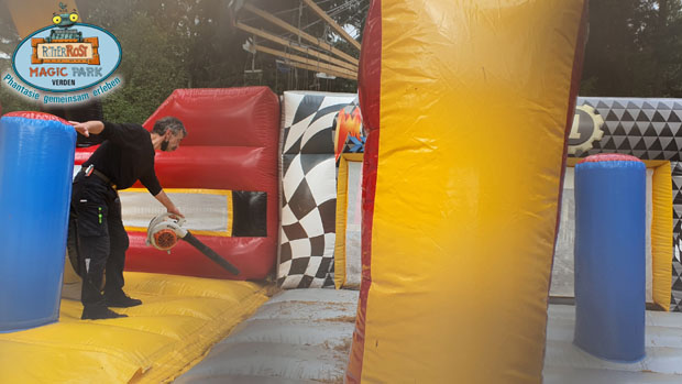 Man glaubt kaum, wie viel Arbeit Hüpfburgen machen. Jeden morgen müssen die riesigen Spaßmaschinen aufwändig vom Schmutz der Nacht gereinigt werden. Hat es geregnet, ist die Prozedur besonders aufwändig.