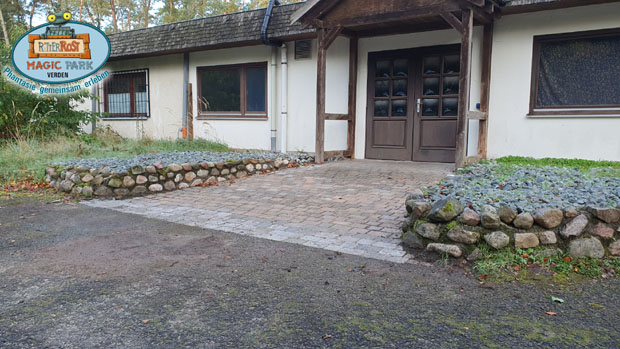 Auch der neue Zugang zur Verwaltung nimmt Gestalt an. Die Pflasterfläche ist wieder hergestellt. Nur im inneren des Gebäudes warten noch so manche Handgriffe.