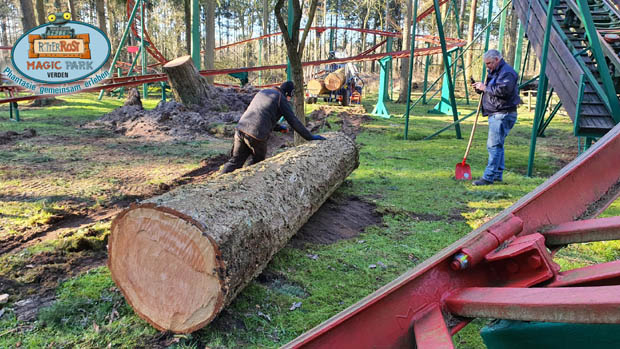 Die Stürme vor 2 Wochen halten uns weiter in Atem. Die Achterbahnschienen sind bereits zum Hersteller Zierer nach Deggendorf in Bayern transportiert worden. Jetzt müssen noch die Baumstämme aus dem Innenbereich der Achterbahn entfernt werden. Da man dort nur schlecht hin kommt, müssen die Stämme mit Seilwinden aus dem Bereich "herausgerückt" werden, so wie es der Fachmann sagt.