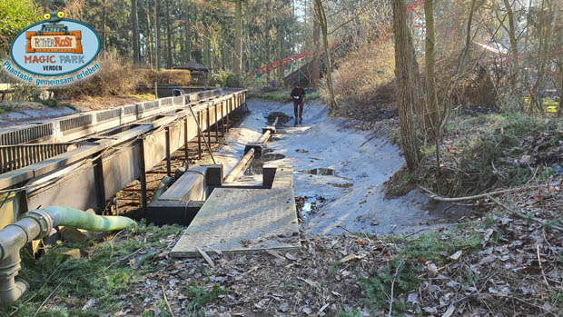 Bevor das Becken der Wasserbahn wieder geflutet wird, sind hier ein paar Arbeiten nötig. Dieser Bereich kann nur im Frühjahr gut erreicht werden, in der Sommersaison ist das Becken voll Wasser und Arbeiten sind dort kaum möglich. Aktuell wird das Becken gereinigt, anschließend werden kleinere Reparaturen vorgenommen und ein paar Anpassungen an der Wasseraufbereitung vorgenommen, um die Attraktion ein wenig wartungsfreundlicher und zuverlässiger zu gestalten.