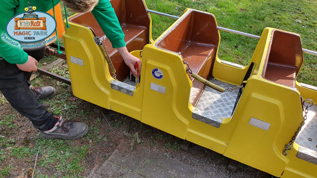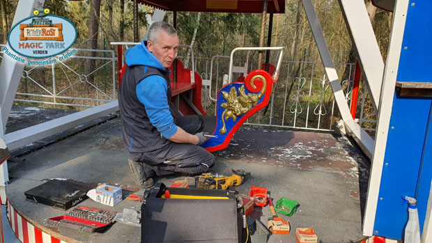 Parallel müssen aber auch die Attraktionen, die den ganzen Winter über in Betrieb waren weiter in Schuss gehalten werden. Thomas repariert einen Tür am Riesenrad.