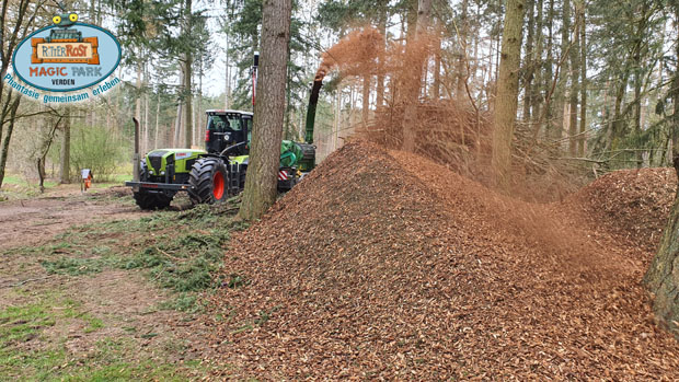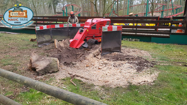 Auch die Beseitigung der Sturmschäden hält uns weiter auf Trab. die riesigen Mengen an Sturmholz müssen geschreddert werden. Da ist großes Gerät gefragt. Aber auch die ganzen Baumstubben müssen entfernt werden. Allein das dauert 2 Tage mit einer besonders starken Stubbenfräse.