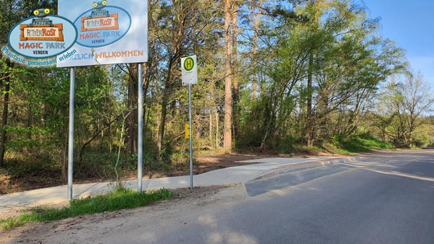 Aber noch mehr Neuerungen: Mittlerweile ist die neue Bushaltestelle an unserer Einfahrt fertig, nur das Wartehäuschen fehlt noch. Jetzt könnt ihr richtig schön aus dem Bürgerbus hier aussteigen und den Park besuchen.