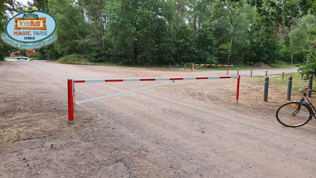Im Bereich der Einfahrt werden neue Poller gesetzt, um dort den Verkehr zu ordnen. In Verbindung mit den Schranken kann man hier in Zukunft weiter wenden, aber auf den Parkplatz kommt man nicht, wenn der Park geschlossen ist. Der Wendeplatz ist wichtig für den Bus, der hier bei uns hält.